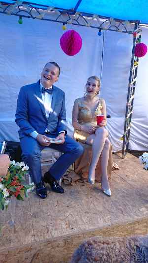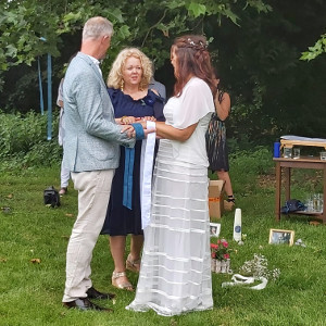 Immanuel en Anouska vroegen mij voor hun (corona proof) intieme bruiloft in hun tuin in het liefelijke Grootschermer. Vooral van belang was dat ik de persoon die hen bij elkaar heeft gebracht, en die helaas overleden was, erbij kon betrekken. We hebben met zijn drieeën een prachtige ceremonie in elkaar gezet waarin deze vrouw geëerd werd maar waarin ook de eigen woorden over de liefde tussen hen klonken in prachtige vows en in mijn speech over hun liefde.